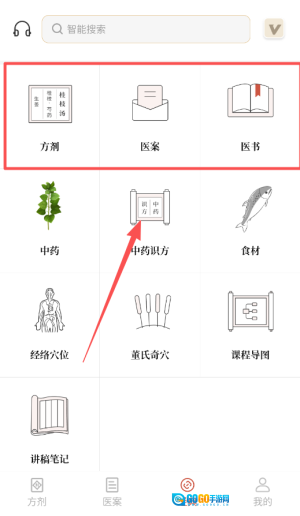 登录软件后,主界面设有智能搜索功能,其中涵盖处方、中药、穴位等多种类别,点击对应图标就能进入学习区。