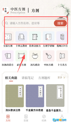 2. 使用处方功能时,您可以在搜索框中输入姓名或症状搜索。在页面底部,有分类推荐,如“十四五”计划教材和汤底韵,帮助你系统地学习。