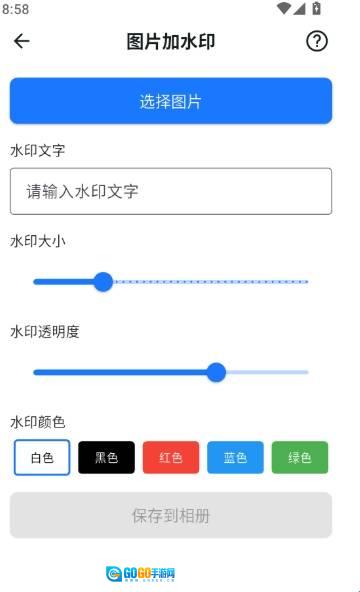 5、最后选择图片,输入水印文字,调节水印大小,设置水印透明度和水印颜色,然后点击“保存到相册”按钮,这样就完成了。