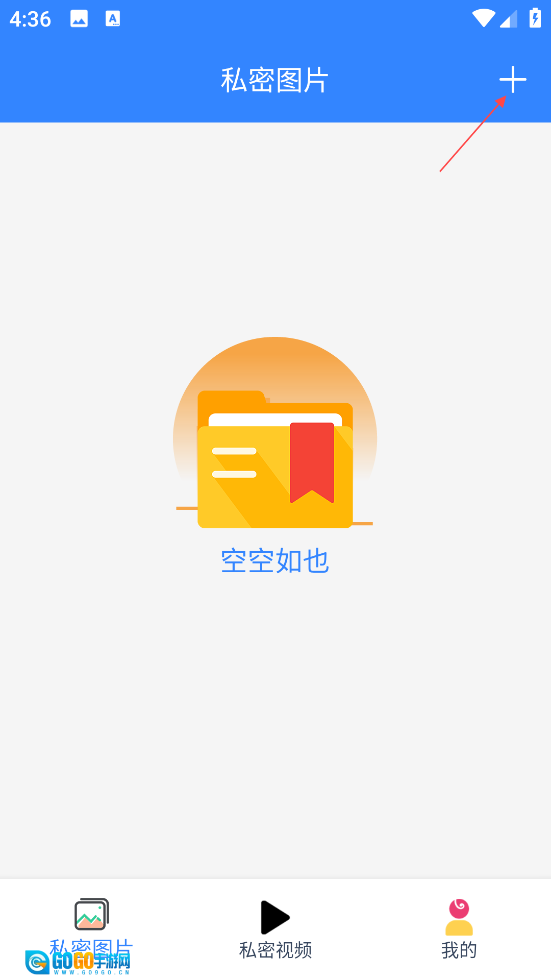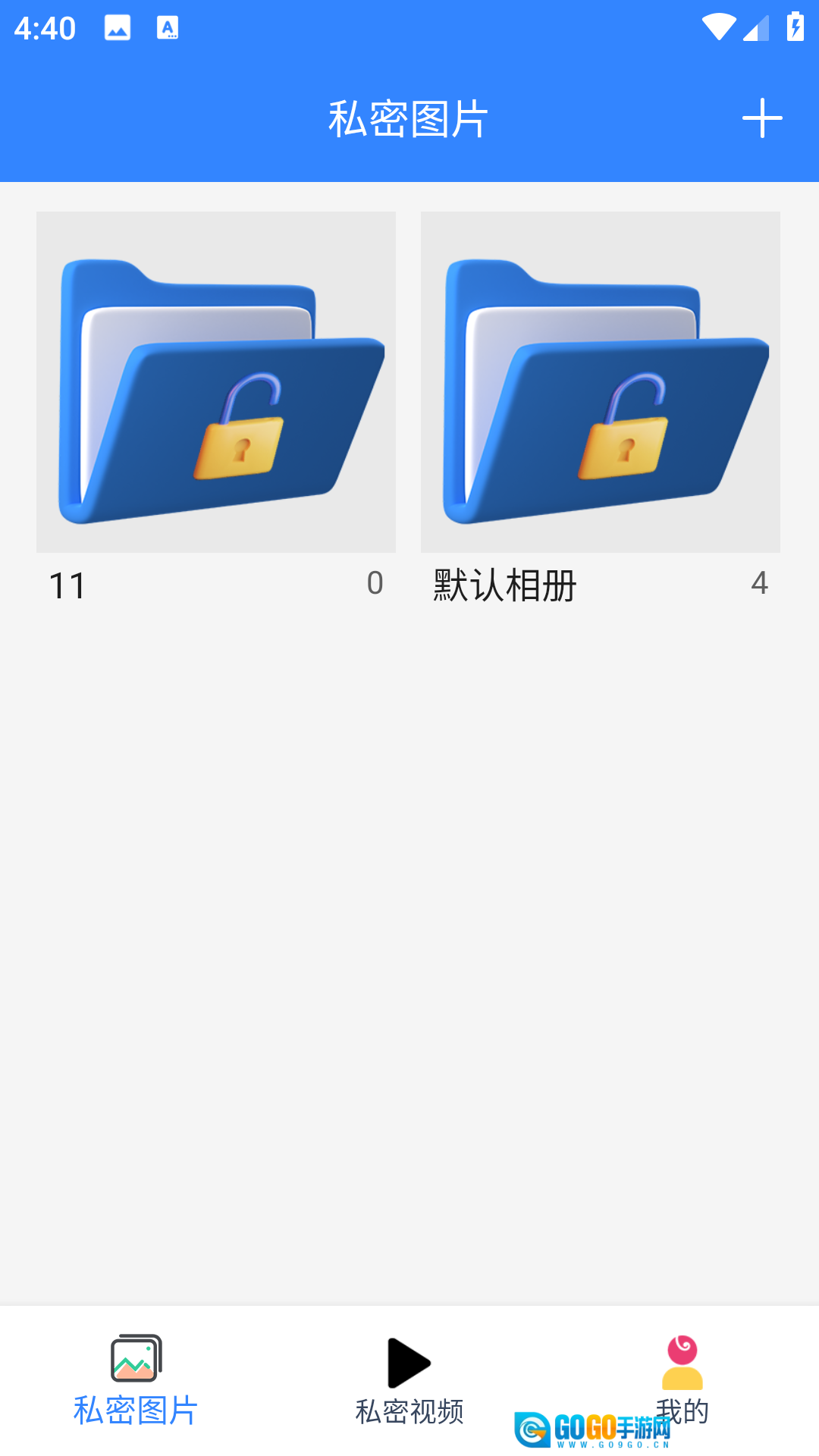 2、进入【私密图片】或【私密视频】界面后,点击右上角的“+”图标。