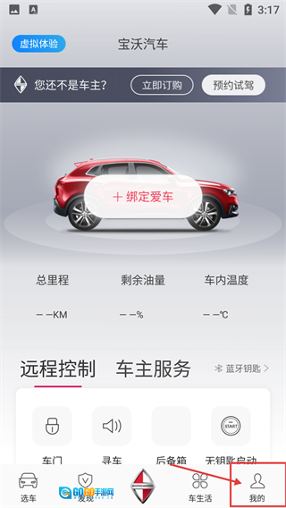 1、在宝沃汽车的主界面,点击底部的【我的】选项进入个人中心页面,该页面具备车辆绑定、远程控制等功能,这些功能需要登录账号后才能使用。