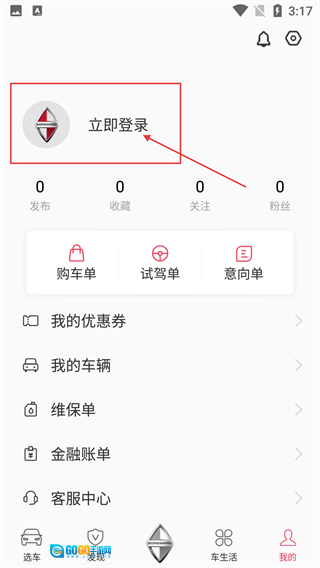 进入个人中心后,点击顶部的【立即登录】区域,就能跳转到登录界面,这个页面里设有购车单、优惠券等供车主使用的服务入口。