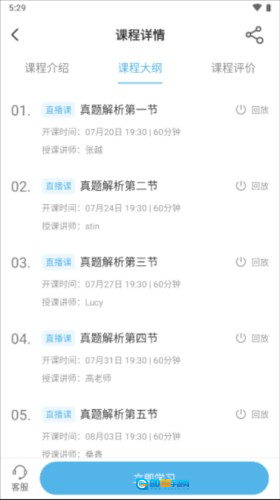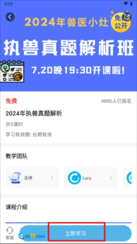 2、向下滑动页面能够查看课程的大纲介绍,点击报名按钮后会显示“立即学习”选项。