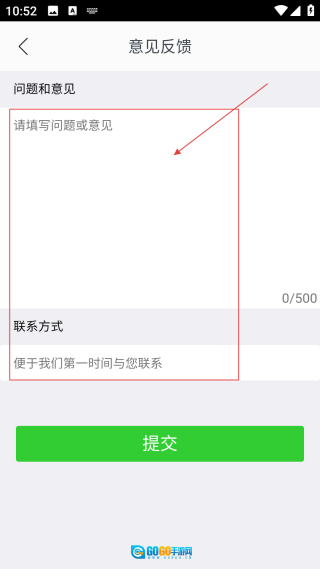 3、进入意见反馈界面后,填写【问题、意见以及联系方式】。