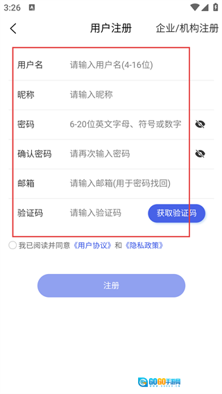 4、【用户注册】页需填【用户名-(4-16位)】-【昵称】等信息,填验证码后同意协议点击注册。