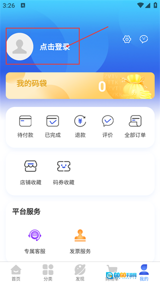 2、进入个人页面后,点击【点击登录】区域,该页包含【待付款】-【店铺收藏】等功能入口。