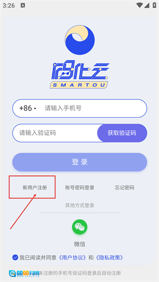 3、登录页需填写【请输入手机号】并获取验证码,也可点击【新用户注册】,支持微信等方式登录。