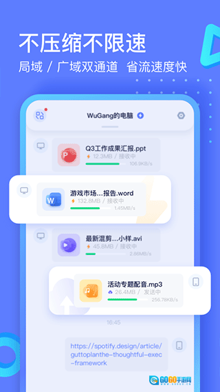 1、这款软件的工作原理是借助局域网内的WiFi进行数据传输,因此速度十分迅速。