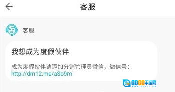2、选择【度假伙伴】选项后,系统会自动跳转至客服页面,点击页面内的链接可直达分销管理员的微信界面,添加对应的微信号并申请成为度假伙伴,成功后就能获取相应的佣金奖励。