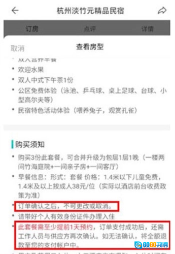2、点击【查看详情】,了解购买须知,特惠房型(或使用房券)在订单确认后不可更改或取消,建议订房前了解清楚。
