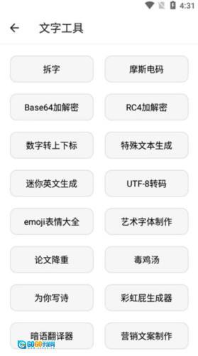 7、文字相关工具:包含摩斯电码转换、Base64加解密处理、艺术字体设计制作、营销类文案撰写、服务协议自动生成、吃鸡游戏彩色字体设置、王者荣耀特殊名称生成等功能。