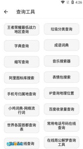 4、打开查询工具,就能查看王者荣耀最低战力地区、垃圾分类、字典查询、成语查询、缩写查询、表情包搜索等内容;