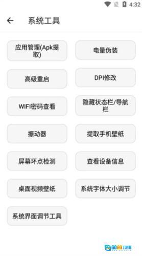 2、系统工具包含应用管理apk提取、WIFI密码查询、手机壁纸提取、振动器、桌面视频壁纸等功能。