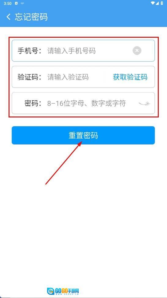 3、要是忘记了密码,可进入密码找回页面,输入手机号和验证码,设置好新密码后点击【重置密码】功能按钮,就能完成密码重置操作。