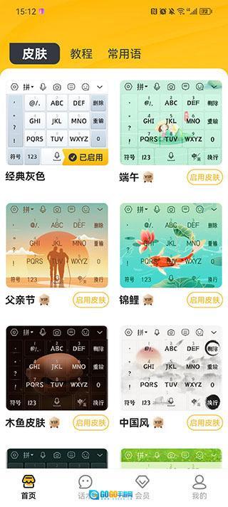 2、用户可点击首页,首页设有皮肤、教程、常用语三个功能供使用。