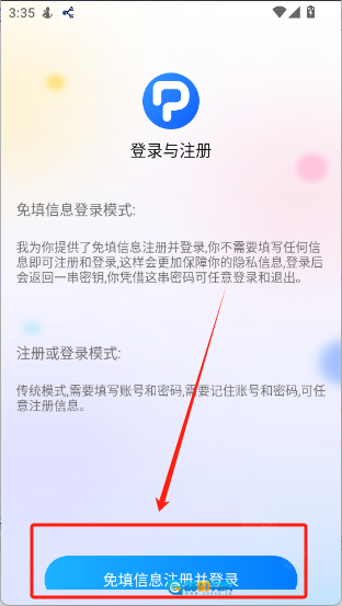 2、点击右下角的“我的”,接着点击“免填信息注册并登录”按钮