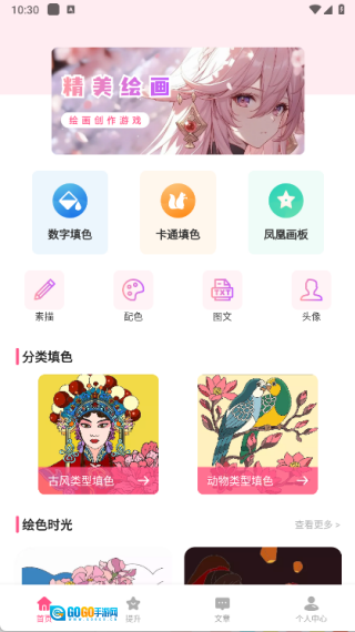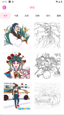 1、首页设有数字填色、卡通填色、凤凰画板、素描、配色、图文及头像等功能模块。