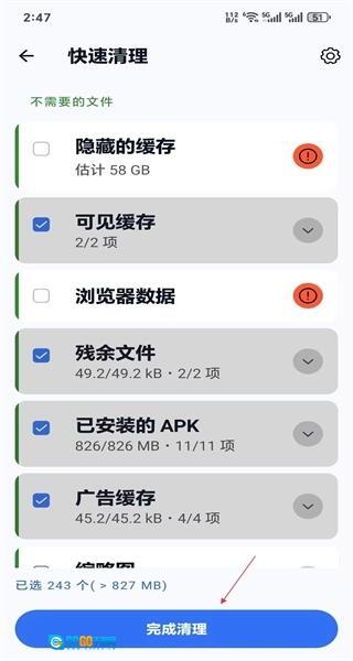 4、进入快速清理界面后,可对需要清理的文件类型进行选择,选好后点击“完成清理”按钮,即可完成设备清理操作。