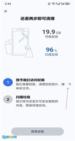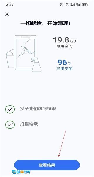 完成权限授予与垃圾扫描后,界面会显示“一切就绪”,此时点击“查看结果”即可进入快速清理界面。