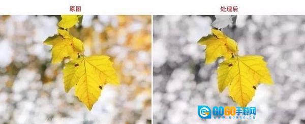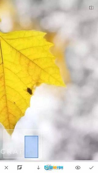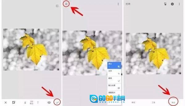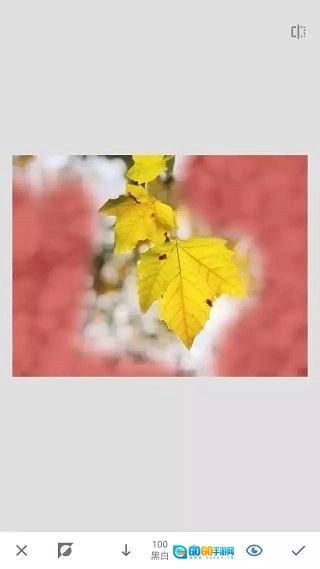 第四步,涂抹操作完成后,点击右下角的“√”确认,接着点击左上角的箭头返回主页面,此时背景会变成黑白,而树叶仍保留原本的黄色,直接导出照片就可以了,这样就完成了一张蒙版单一色彩的处理。