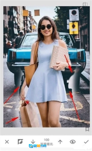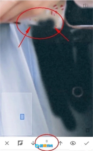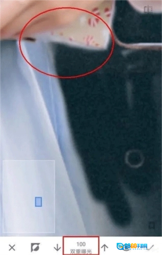 10、在处理人物边缘轮廓的涂抹时,我们可以用大拇指和食指在图片上做扩张操作,把图片放大到最大来方便处理。不过就像下图所示:即便把图片放到最大,人物小轮廓区域的手指还是显得太大,难以实现精确涂抹。针对这种情况,建议先通过设置双重曝光数值为0,来隐藏部分内容。