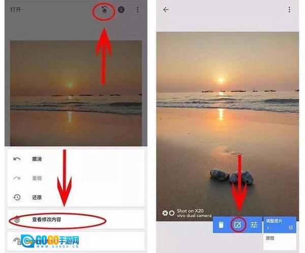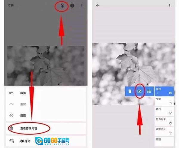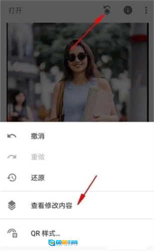 第二步,点击右上角的箭头,接着查看修改内容,然后进入蒙版选项。