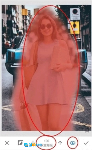 7、进入蒙版界面后,需留意相关参数。此时双重曝光的参数值为100,使用画笔在图片上涂抹后,被涂抹的区域便会呈现出人物图像。这表明,当我们以100的双重曝光数值对图片进行涂抹时,图片会显示后续添加的人物图片;相反,若将双重曝光参数调整为0后再进行涂抹,图片则会重新呈现出以车辆为背景的效果。