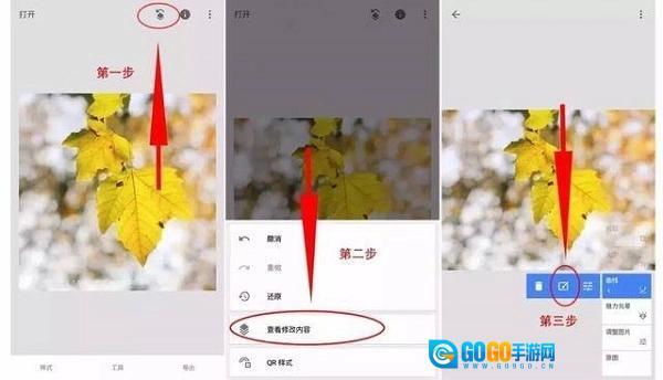 要进入【蒙版】工具,需先在Snapseed主页面右上角点击“向左箭头”按钮,接着选择“查看修改内容”,随后找到对应的调整步骤,点击“箭头”图标,再点击中间的按钮,就能进入蒙版操作界面了,具体步骤可参考下图: