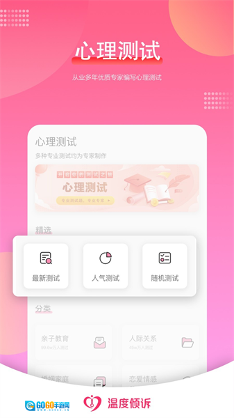 提供丰富多样的心理测试,增强用户的参与感与趣味性;依据用户的实际需求以及倾听者的专业领域,为用户提供精准的匹配服务;用户可以按照分类主题挑选自己感兴趣的内容进行浏览,也能选择喜欢的视频观看。