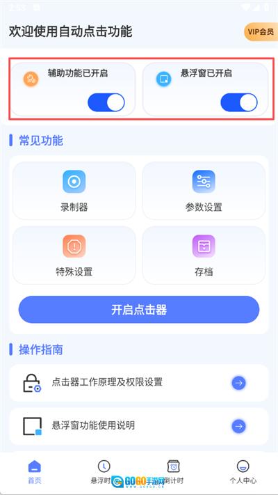 2、点击开启点击器即可使用连点功能