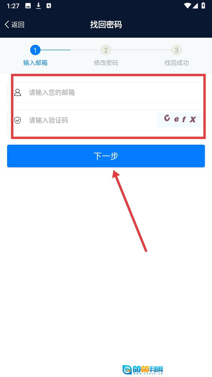 4、在找回密码页面填写邮箱与验证码,点击【下一步】按钮,接着完成后续的密码找回步骤就可以了。