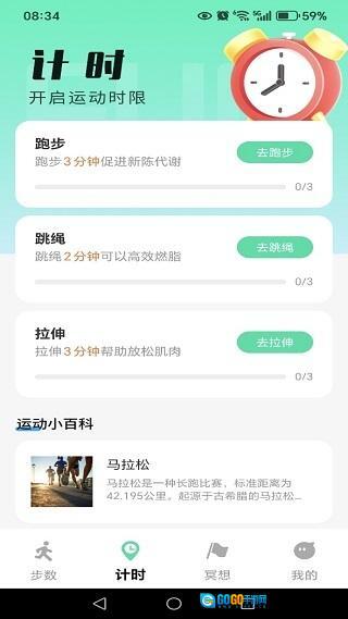 3、计时页面能帮助大家更合理地把控运动时长,同时也能了解运动小百科的相关内容。