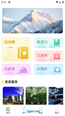 首页设有找攻略、看游记、记清单、找美食、去摄影等分类板块。