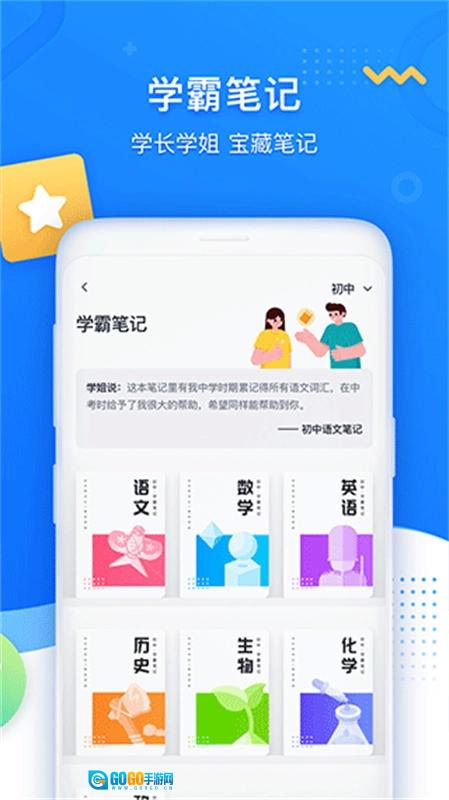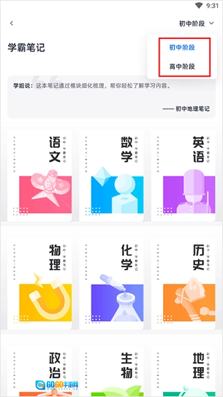 5、此外,平台还提供学霸笔记资源,用户可根据自身需求选择初中或高中阶段的内容。