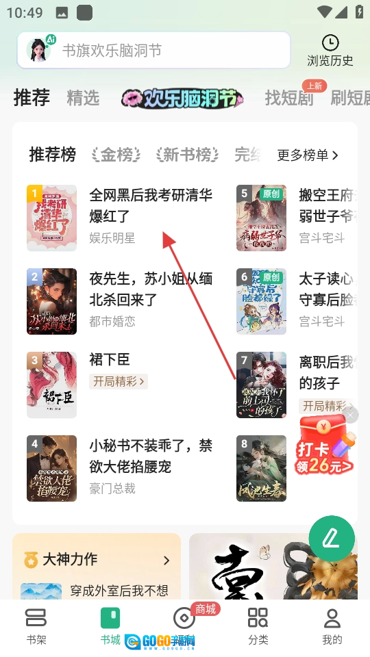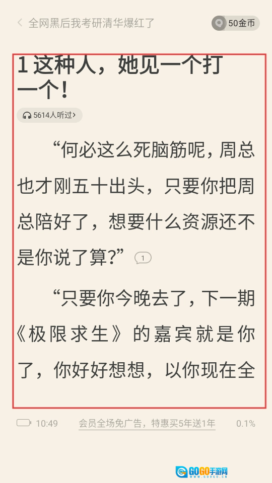 1、在书城推荐榜上选了《全网黑后我考研清华爆红了》,进入阅读页面。