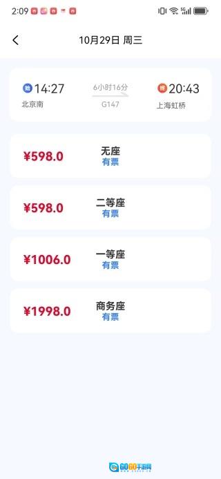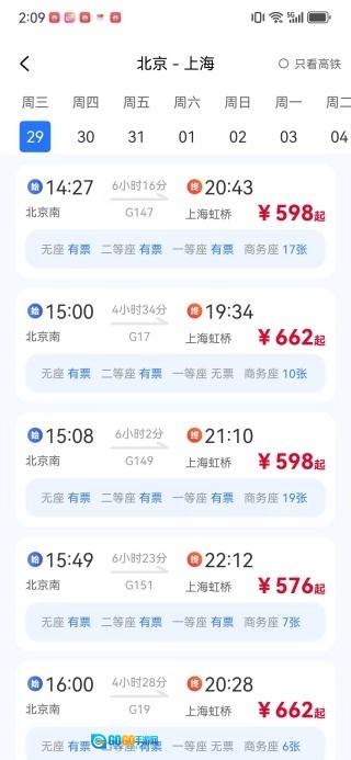 3、系统会实时展示可预订的车次清单,其中涵盖发车时刻、票价信息以及余票情况。