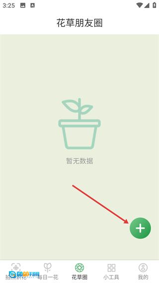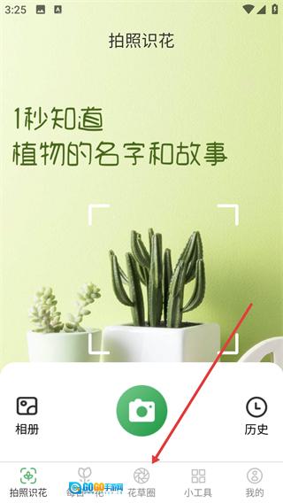 1、打开拍照识花应用后,在首页点击底部的【花草圈】选项,即可进入花草朋友圈的内容管理界面。