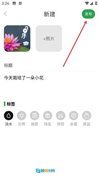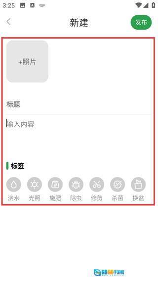 3、在新建页面中,依次添加照片、填写标题与内容,并选择对应的标签(例如浇水),完成编辑操作。