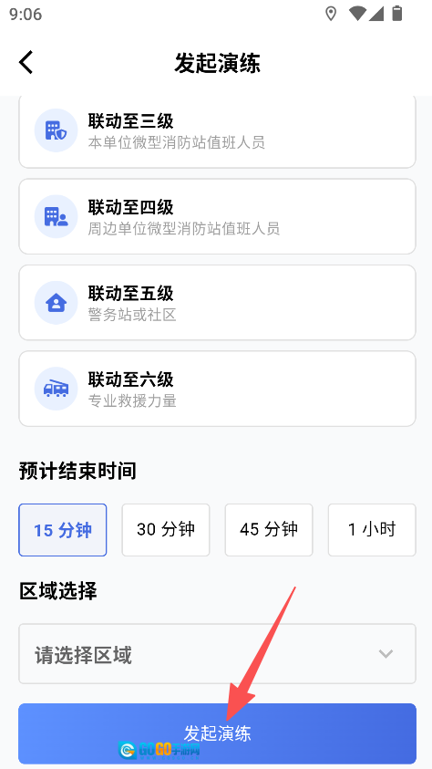 2、进入发起演练的板块,挑选联动级别与预计结束时间,并选定区域。
