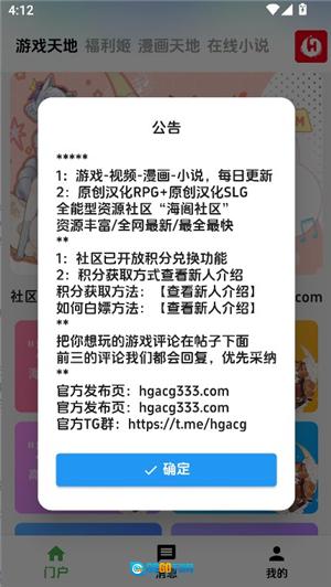 1、进入本页面的海阁社区并打开,看到公告后点击确定按钮就可以了