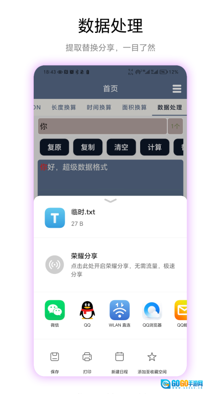 1、具备数据提取、替换与分享功能,支持复制数据、清空数据以及计算结果,并且能够借助社交软件分享经处理后的数据。