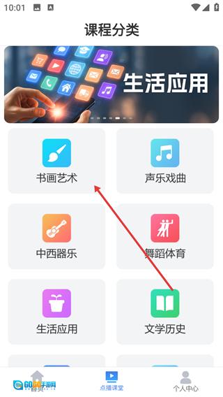 2、进入课程分类界面后,点击选择【书画艺术】分类,即可进入书画艺术课程列表页面。