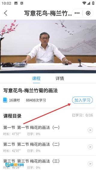 3、在书画艺术课程列表里找到【写意花鸟-梅兰竹菊的画法】这门课,点击进入它的详情页面。