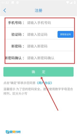 2、填写【号码】和【验证码】,设置【新密码】并再次确认,点击【确定】就完成注册了,注册后可以用这个账号登录应用。