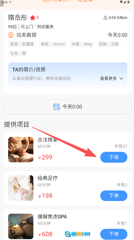 2、在技师详情页的“提供项目”板块中,找到具体服务后,点击该项目右侧的“下单”按钮即可。