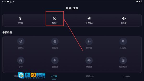 1、进入【小工具】页面后,在实用工具区域找到【指南针】选项并点击,就能进入指南针的功能界面。