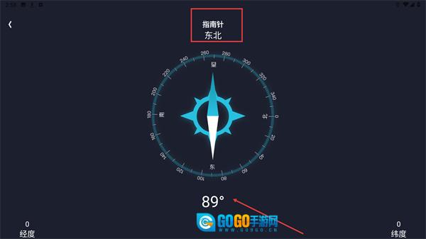 进入指南针界面后,能够查看当前方向(例如【东北】)以及对应的角度数值,以此实现方位识别的功能。