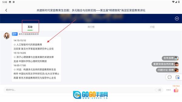 3、在直播页面的【互动】标签栏中,可以查看这场直播的议程安排、讲师信息等相关内容,以便了解直播的具体环节设置。