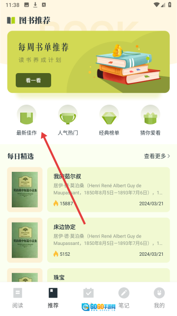 2、推荐页选【最新佳作】,浏览近期优质书籍列表。