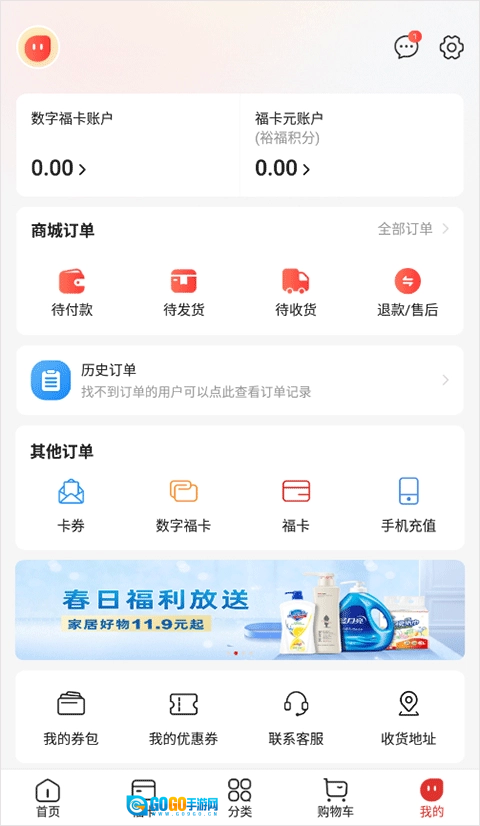 1、首先打开福卡商城,在我的功能,点击副卡账户;